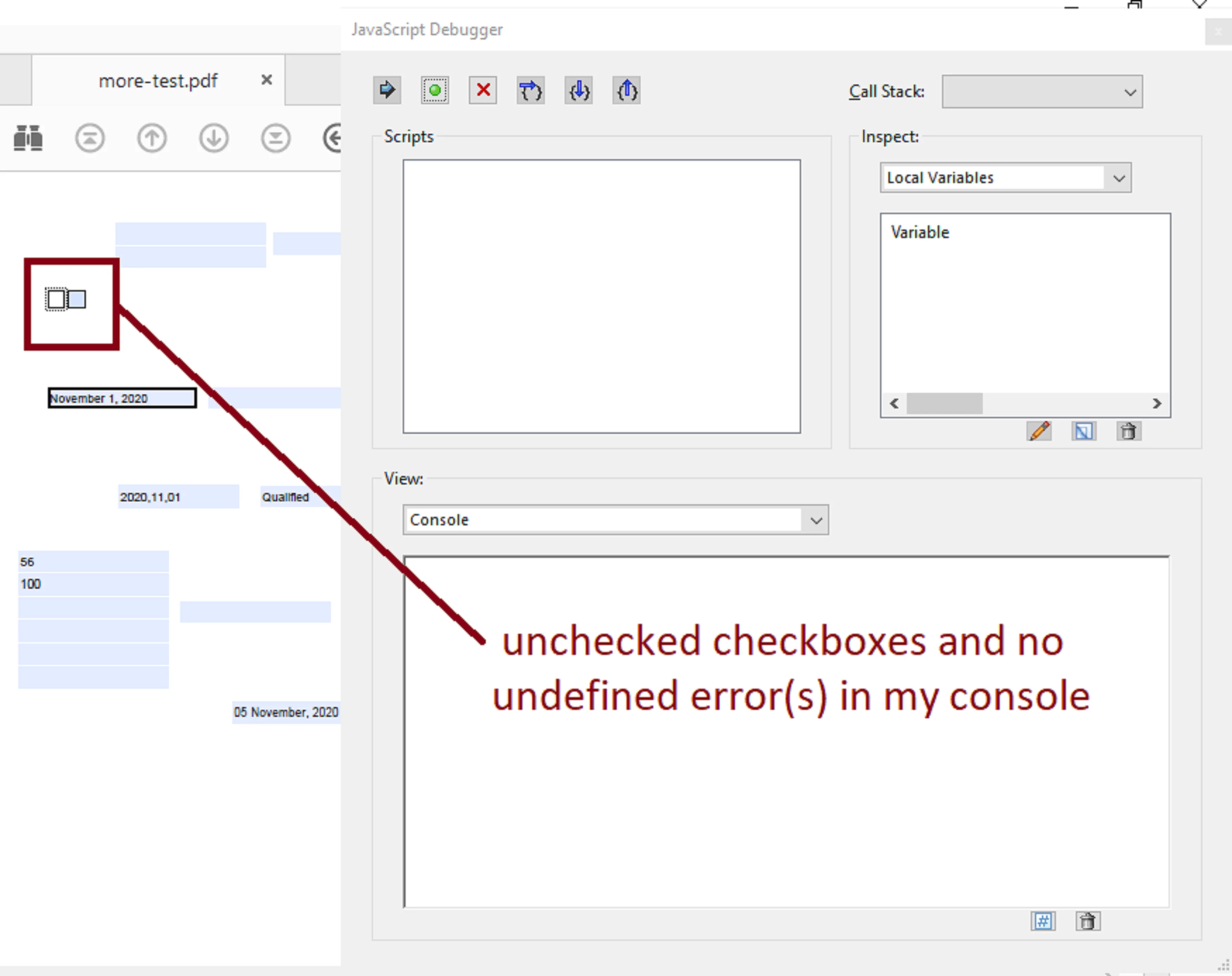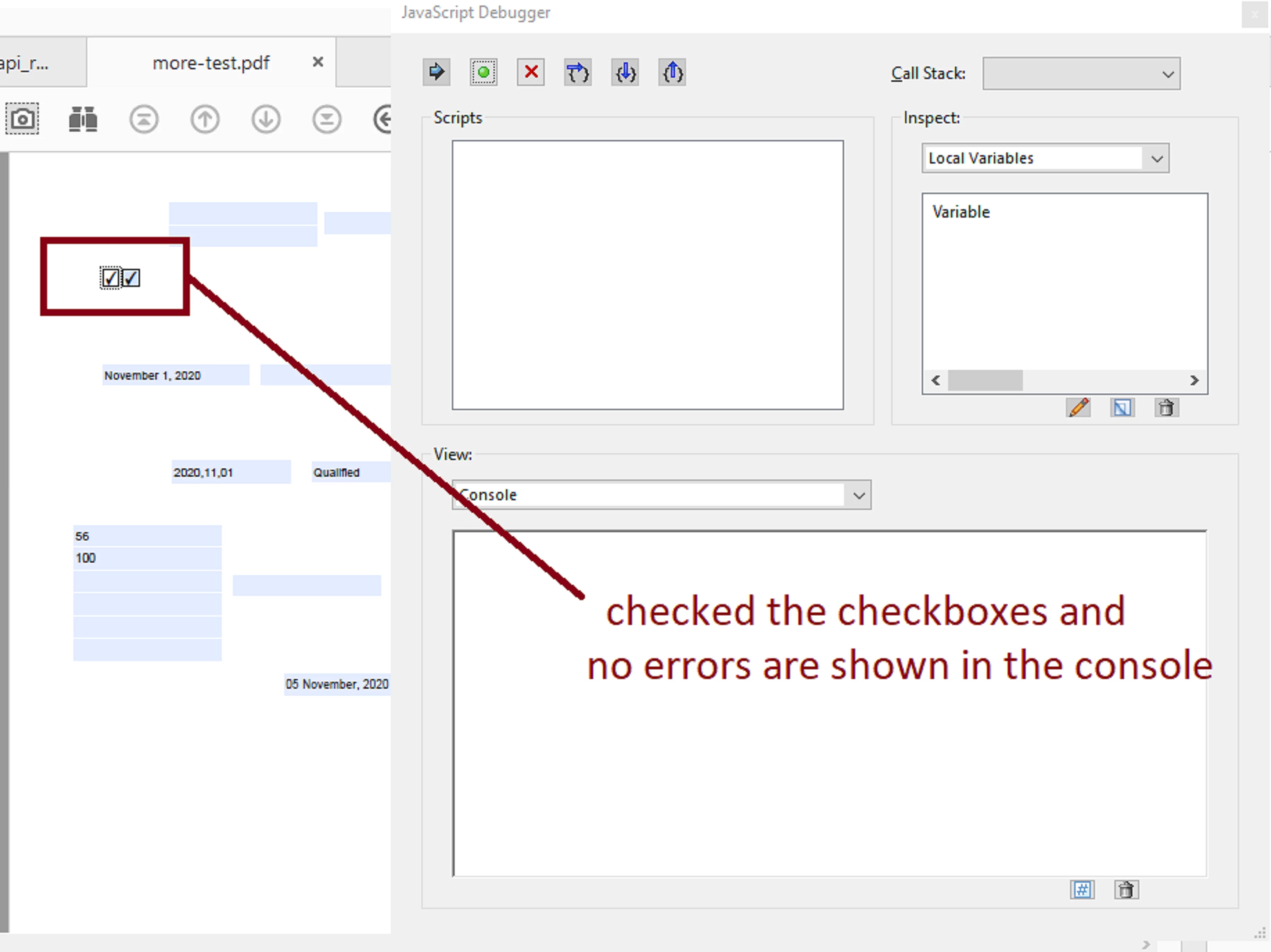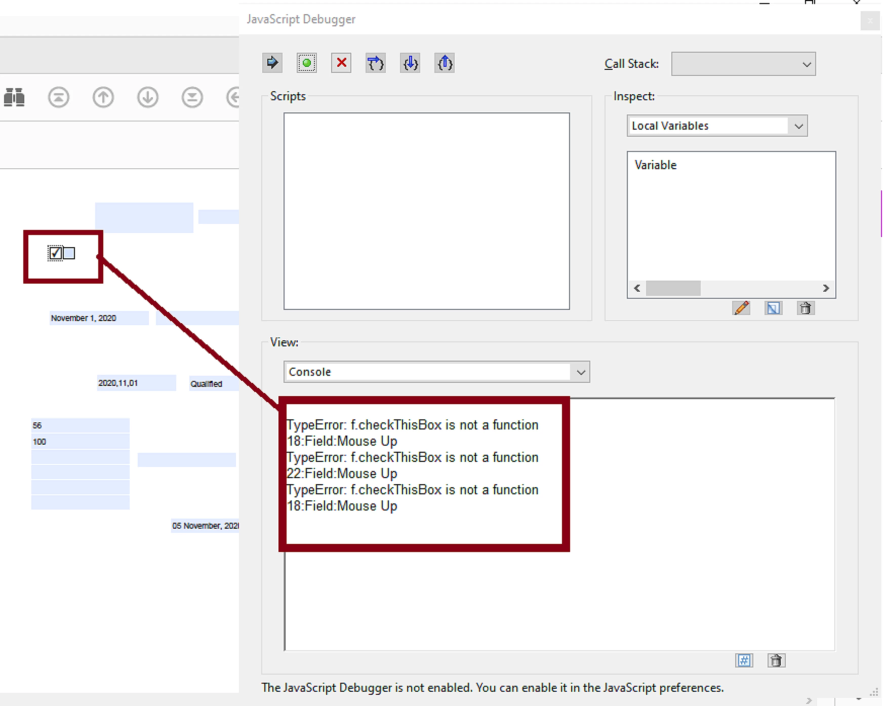 I have an Acrobat form with a checkbox that checks another checkbox. I have used the mouseUP action in the original checkbox to Run a Javascript to check the 2nd checkbox which works.