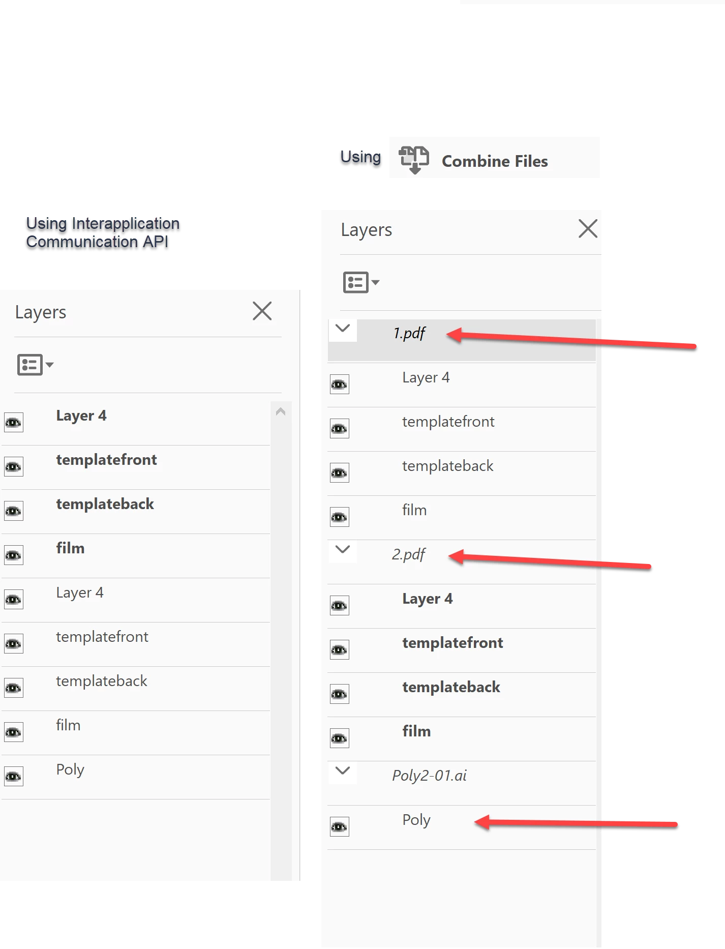 The difference being 1) The combine button creates layers for each PDF document and with the document layers created as sub layers whereas the snippet just created the doc layers without the parent layers as per document name. 2) The button automatically creates bookmarks for each document, the snippet doesn't.