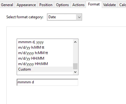 When I custom format a text box with Date/ Custom/ mmmm d, and choose a date with other than the current year, and return to it, it has reverted to the current year. I have a field next to it for the year of what they picked, so it needs to be accurate.