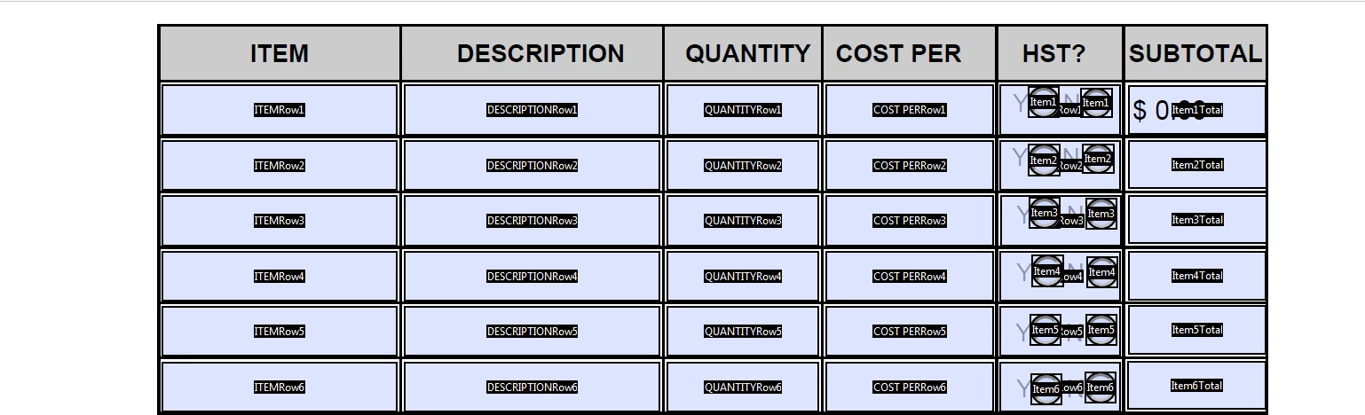 Hi all, I'm extremely new to this and it's generally outside of my wheelhouse so I'm looking for a bit of help. I'm hoping to create a budget form that allows people to select whether or not the item will be charged Harmonized Sales Tax (which is 13% where I'm from). Not all items are taxed so I'm allowing them to choose via a radio buttom whether tax is applicable. I'd like if they choose 'Y' the subtotal should calculate the 13% tax, and if they choose 'N' I'd want it to simply calculate based on the Cost Per and Quantity of the item.
