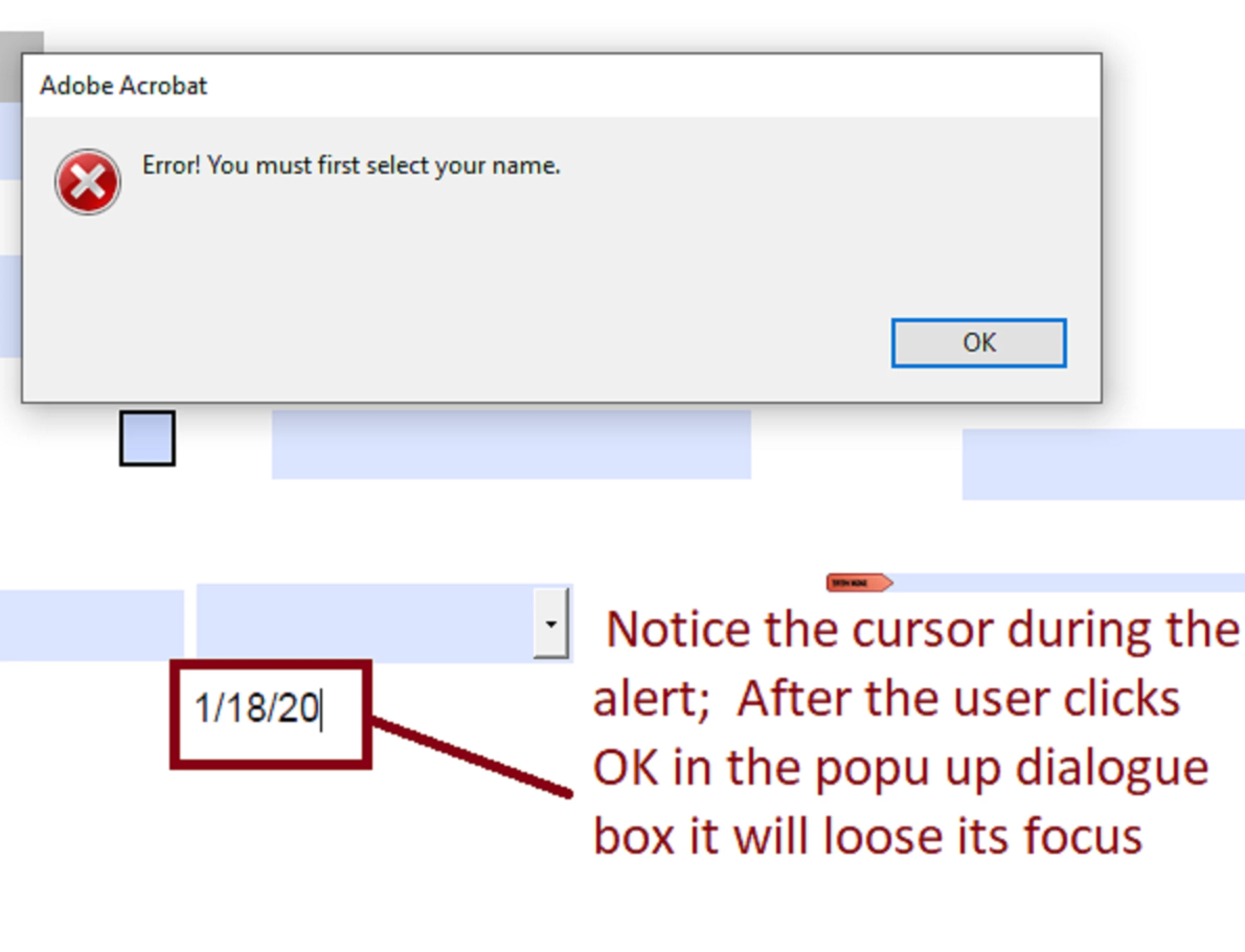 if (this.getField("Employee Name").valueAsString==this.getField("Employee Name").defaultValue) { app.alert("Error! You must first select your name.") event.rc = false; } |