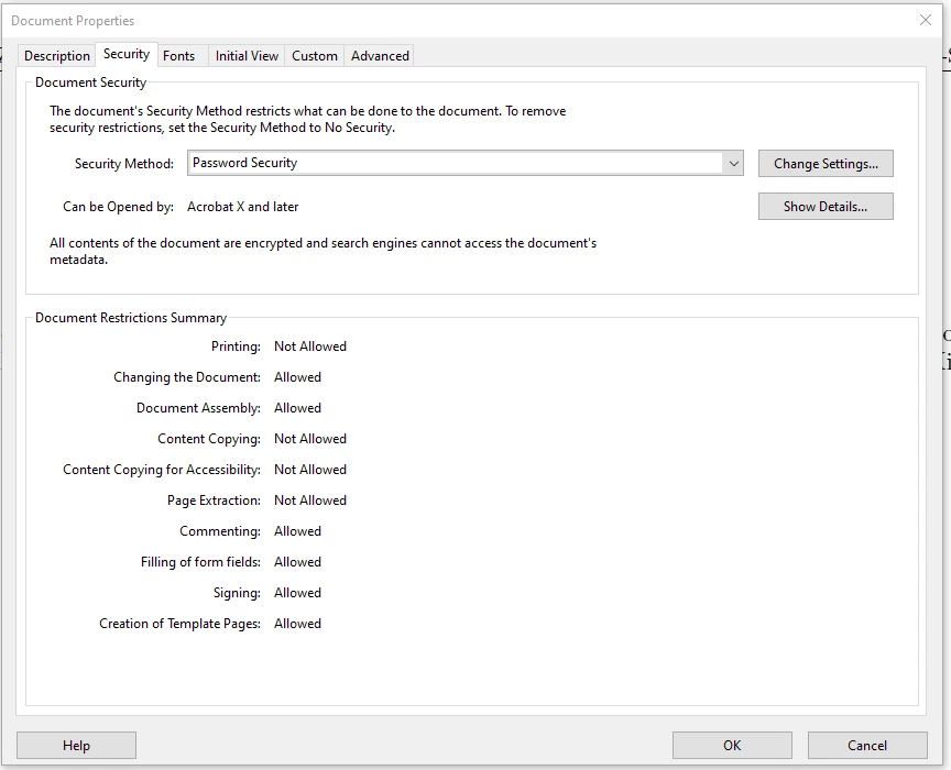 5. Open the secured pdf, provide the user password below should be the security settings.