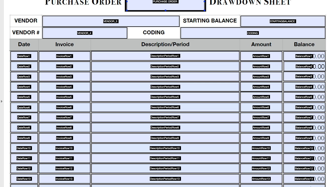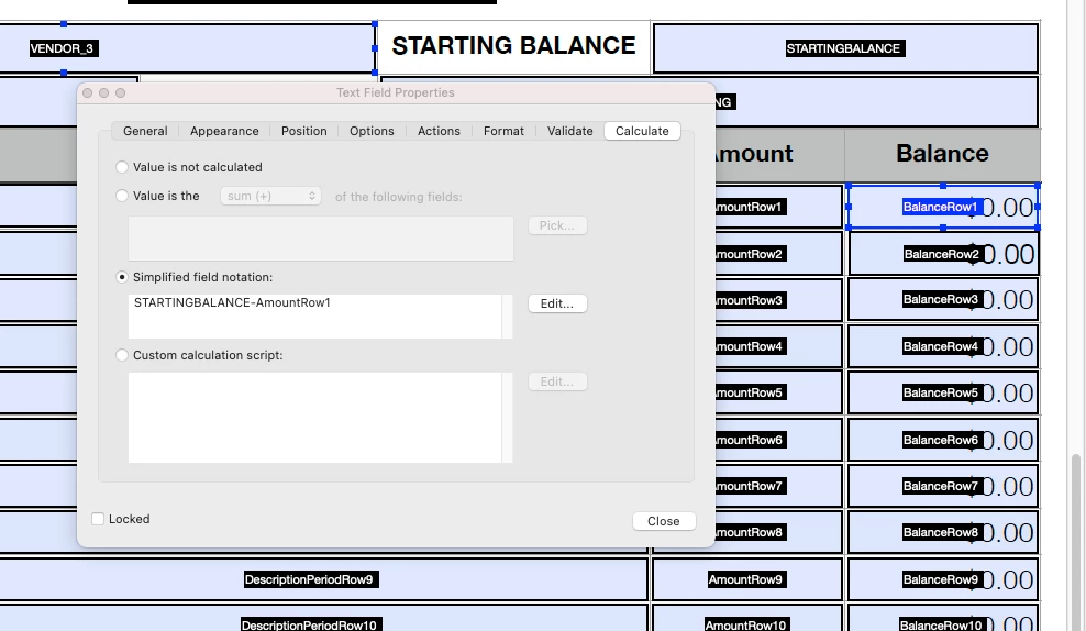 I've created a "drawdown sheet" that tracks reoccurring payments/invoicing on a PO. I can't do it as a spreadsheet because it attaches to the pertinat PO which is a PDF. A drawdown will have the starting balance (the amount for which the PO is written) and show the running balance as each weekly billing is paid. I've attached a screen shot of the form and the issue. The calculation is a simple subtraction from the previous balance but the issue is that the formula is performed down the sheet. I tried to do an if,then statement: If "2amount" is > 0 then "1balance" - "2amount", if else then leave "$0.00". Obviously that isn't Javascript but that is my problem - I don't spreak Javascript. I scoured the web to find a solution and selfmedicate but it wasn't in the cards for me. I even watched tutorials on basic javascript related to Acrobat but nothing stuck. HELP!!