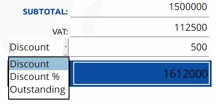 If I select Discount by amount from the dropdown list as the description by the side of the text field; any amount I entered in the text field would be the discounted amount which will affect the “Due Amount” under it, by subtracting that entered discount amount from the “Due Amount”, if it is the Discount by percentage I selected on the dropdown as the text field description, any number I entered in the field would the percentage of the discounted amount, which will, in turn, affect the “Due Amount” by subtracting that percentage from the “Due Amount”  while if its Outstanding amount option I selected from the dropdown list, it means that the amount I will enter into the text field would be added to the supposed “Due Amount”