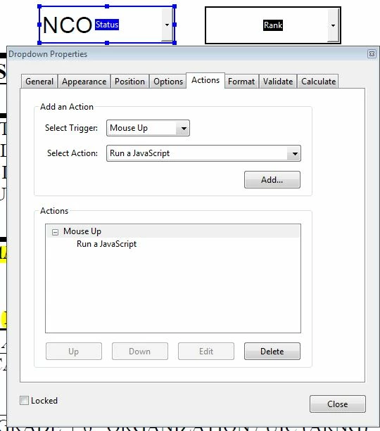 Ok guys and gals. I'm going nuts here. I have been doing a lot of research on a dynamic drop down list for adobe acrobat pro XI. I've seen a few things but nothing is working. Here is what I am trying to do. I have two drop down boxes in a form titled "Status" and "Rank." I want Status to have two labels to chose from; NCO and OFFICER. In the "Rank" field I want the list of either all of the NCO or Officer ranks to appear for selection based upon which option is chosen in the field "Status." I tried this script which has gotten me the closest but only displays the data in the "Rank" field for NCO when NCO is the first item in the list in the "Status" field and the data that does appear in the "Rank" field does not display as drop down options. Rather, it displays as a line of text with commas. If I chose the Officer item as the 2nd item in the list, I get no change in the "Rank" field. It stays populated with the original NCO data. grrrrrr. This script may be too simple and not what I need but it functioned closer than anything else I found. Here is what that script looks like: