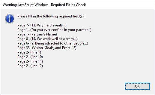 I've a code snippet to pinpoint empty fields within a lengthy form. Ideally, the script sholuld guides me directly to the first blank field. But, if this proves challenging, I'd like it to provide the page number and the information from the tooltip associated with the empty field. My intention is to populate the tooltip with brief descriptions, facilitating rapid identification for users. While the current script effectively notifies me of empty fields names, I seek improvements: displaying the tooltip text instead of the field name and accurately identifying the page numbers, instead of zeros.