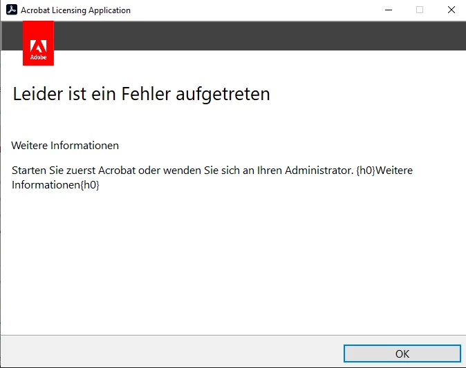 "Starten Sie zuerst Acrobat oder wenden Sie sich an Ihren Administrator. {h0}Weitere Informationen{h0}"