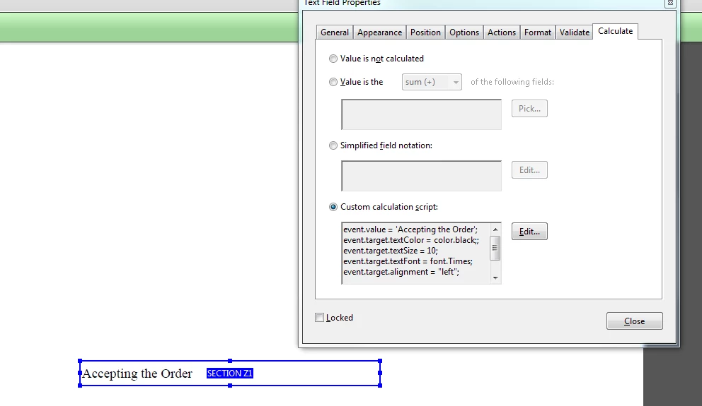 This is my code, how to fix the "Arial Black" font in the text field and I am using this in "Custom calculation script".