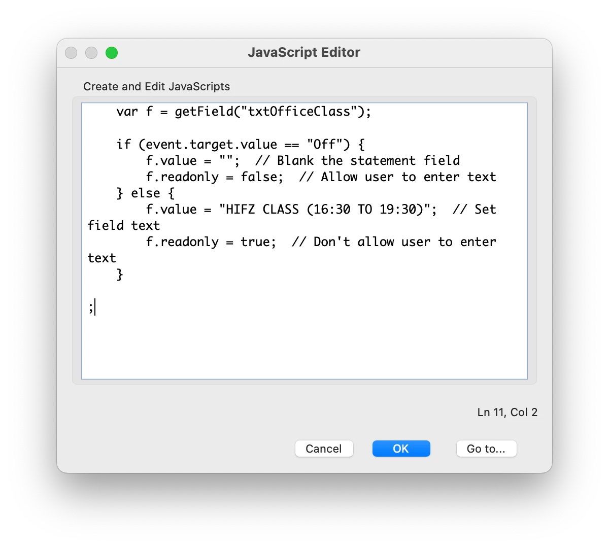 { // Get a reference to the text field var f = getField("txtOfficeClass"); if (event.target.value === "Off") {