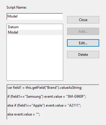 var field1 = this.getField("Brand").valueAsString;