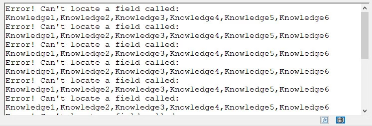 If I'm understanding correctly, it is ignoring the array and just creating one long string of the array elements. I've tested this and cut the array down to only include "Knowledge1" and the script works perfectly for that one field. I've read through all of the comments on every post I've found discussing this and similar scripts, but no one else seems to have run into this issue, so any help would be greatly appreciated!