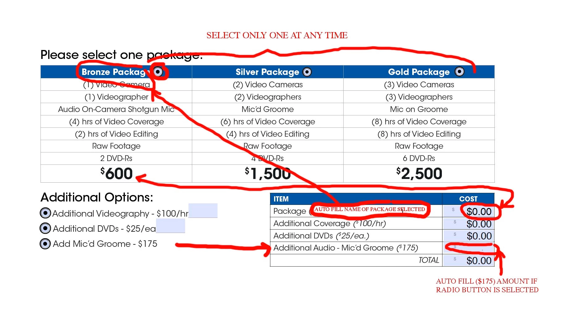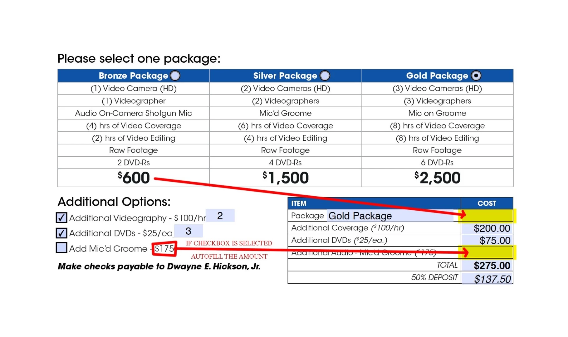 I'm creating a form within Acrobat Pro 9 and need assistance in a few areas. The form is for my wedding videography business. I've created the form which has a calculating table to calculate the total cost of the production.