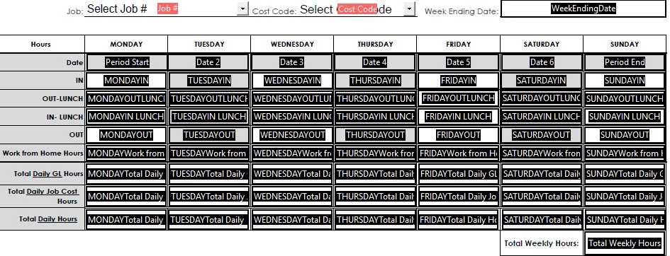 (MONDAYOUTLUNCH - MONDAYIN) + (MONDAYOUT-MONDAYINLUNCH) + "WorkFrom Home Hours" = "MONDAYTotal Daily" The employee would separate out their own time in the boxes named "MONDAYTotal Daily GL Hours" and "MONDAYTotal Daily Job Cost Hours"