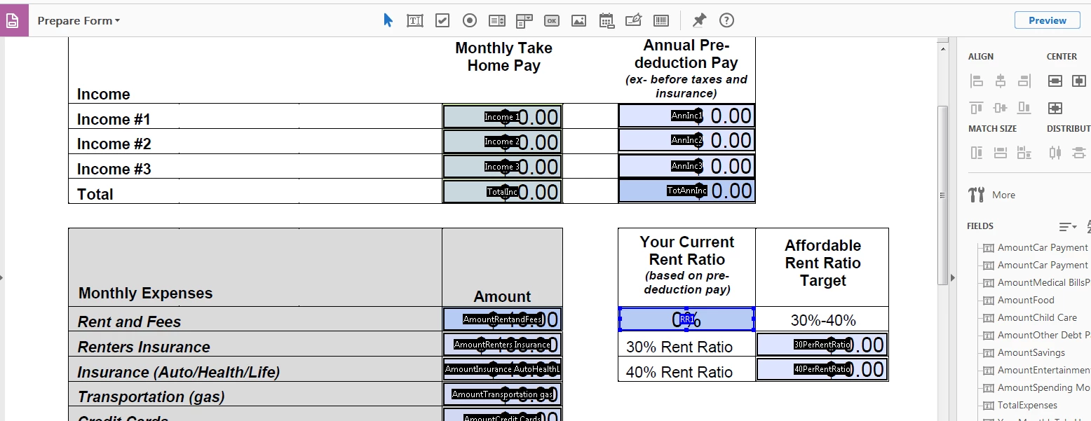 I'm working on a fillable pdf budget sheet. I want to add in formulas to calculate percentages. I found the code below to remove my "Warning: Javascript Window" issue from a previous forum article. I also want to add in the equation "AmountRentandFees/(TotAnnInc/12)". It works as a stand alone equation but it does not work with the code below. Is there a way that I can use both?? I'm not JavaScript savvy. Any simple ideas people may have would be greatly appreciated! Thanks!