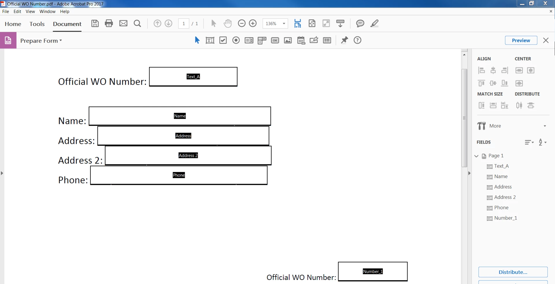 When creating a form using Adobe Acrobat Pro 2017, how can I format a text field ('Text_A' at top of page) to auto populate other text fields ('Number_1', 'Number_2', etc. at bottom of page) within the form? I want to minimize the number of times the form user has to type in the same information within a 10 page form. I included a mock up form below.