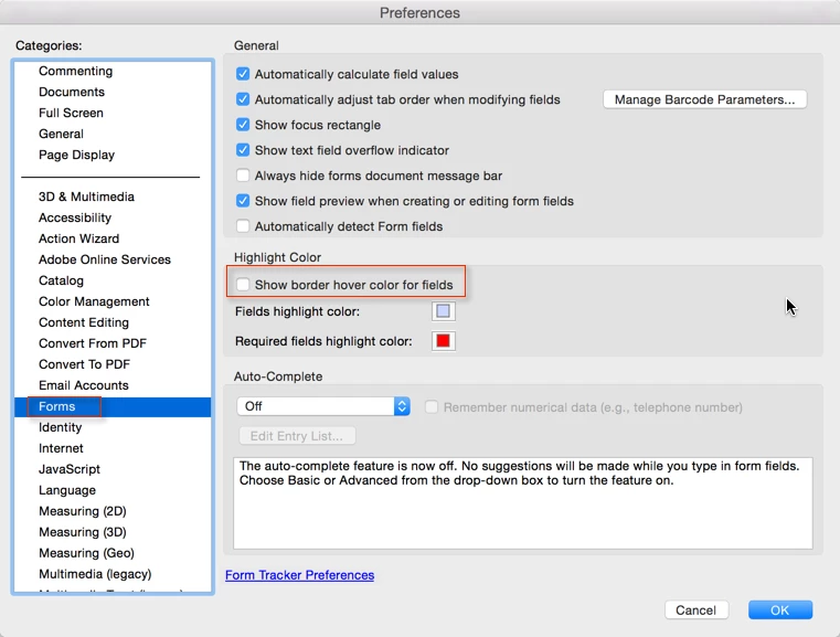 How do I turn off the "Highlie Fields" option in DC on iMac?