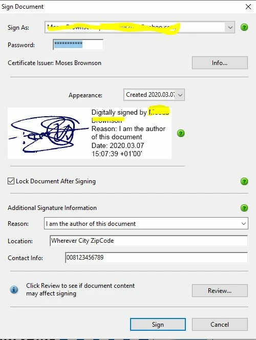 The challenge I have here is that I created two signature credentials as a test, after entering the two passwords and signing with the both signature credentials from the same computer, when next I try to sign the document I discovered that I can select a name from the previously entered two names, its password, but pick from either of the signatures from the “Appearance” created list, and it will sign.
