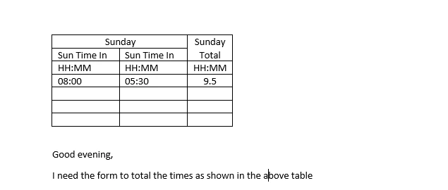 I need help with the below table. Is there a simple script to total the time in an adobe acrobat form?
