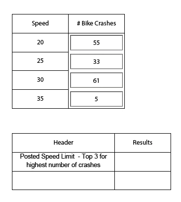 I would like the "Results" field to look at the "# Bike Crashes" and list the top three speeds in this format: