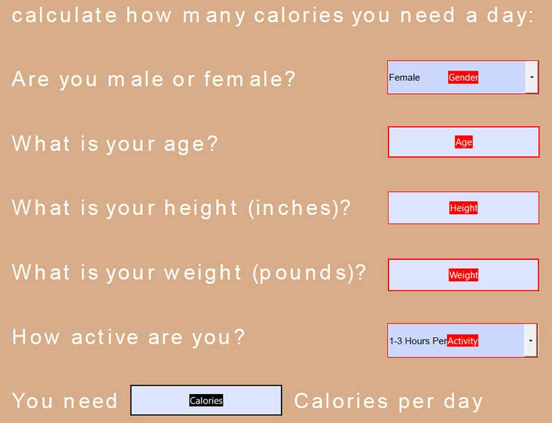 I hope somebody can help me. I'm not a programmer but need to create some calculations within a PDF form. I am trying to calculate the number of daily calories required based on a number of criteria. I have managed to make the calculation work if I am just looking at the values of each field but I need to take into account if the user is male or female. For example: If the user is male then use: 1066 + (6.23 * v4) + (12.7 * v3) - (6.8 * v2) and If the user is Female use: 66 + (6.23 * v4) + (12.7 * v3) - (6.8 * v2).