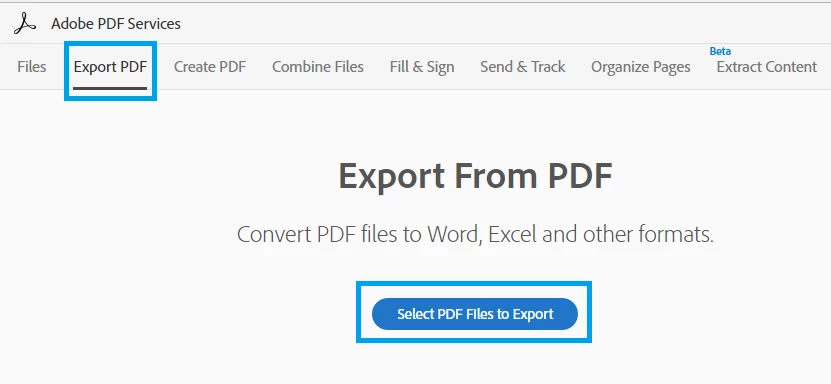 To export the pdf document online, go to this link: https://cloud.acrobat.com/ and select Export PDF>click Select PDF Files to Export>Choose Files from My Computer/Document Cloud>Continue>select the file format in which you want to export to.