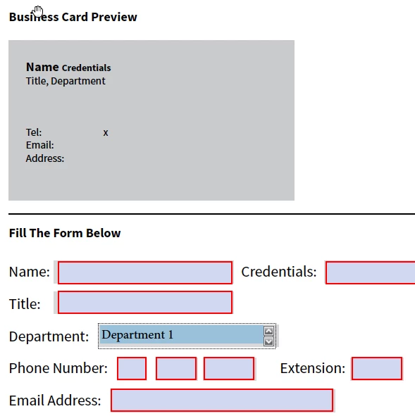 I want to send out a PDF to the staff at work who wants to order a business card. The idea is when they fill the form with their details, a preview of the business card will display their information on the business card mockup.