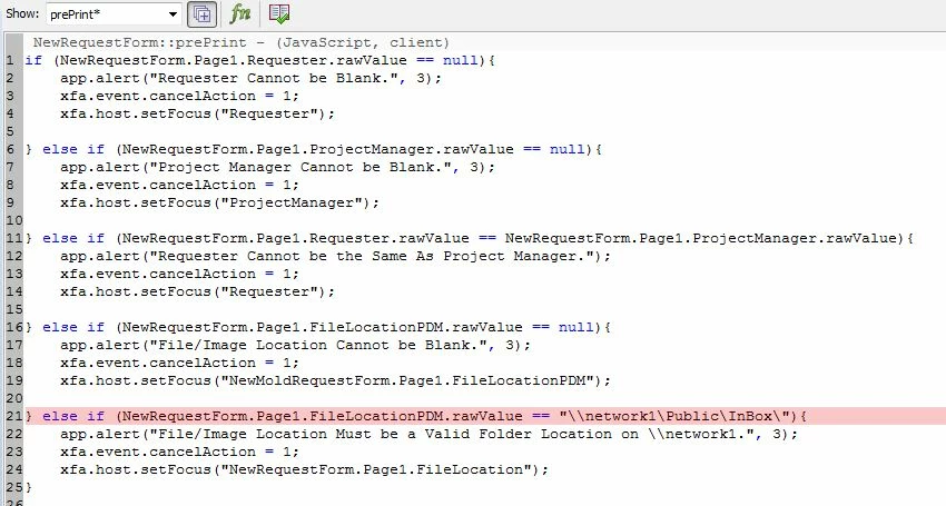 On the preprint event of my LiveCycle Designer (9.0.0.2) form I have a Java if statement that checks if textboxes are null.
