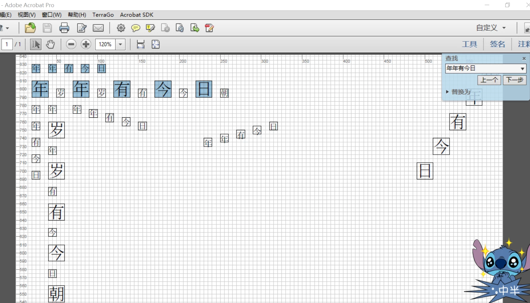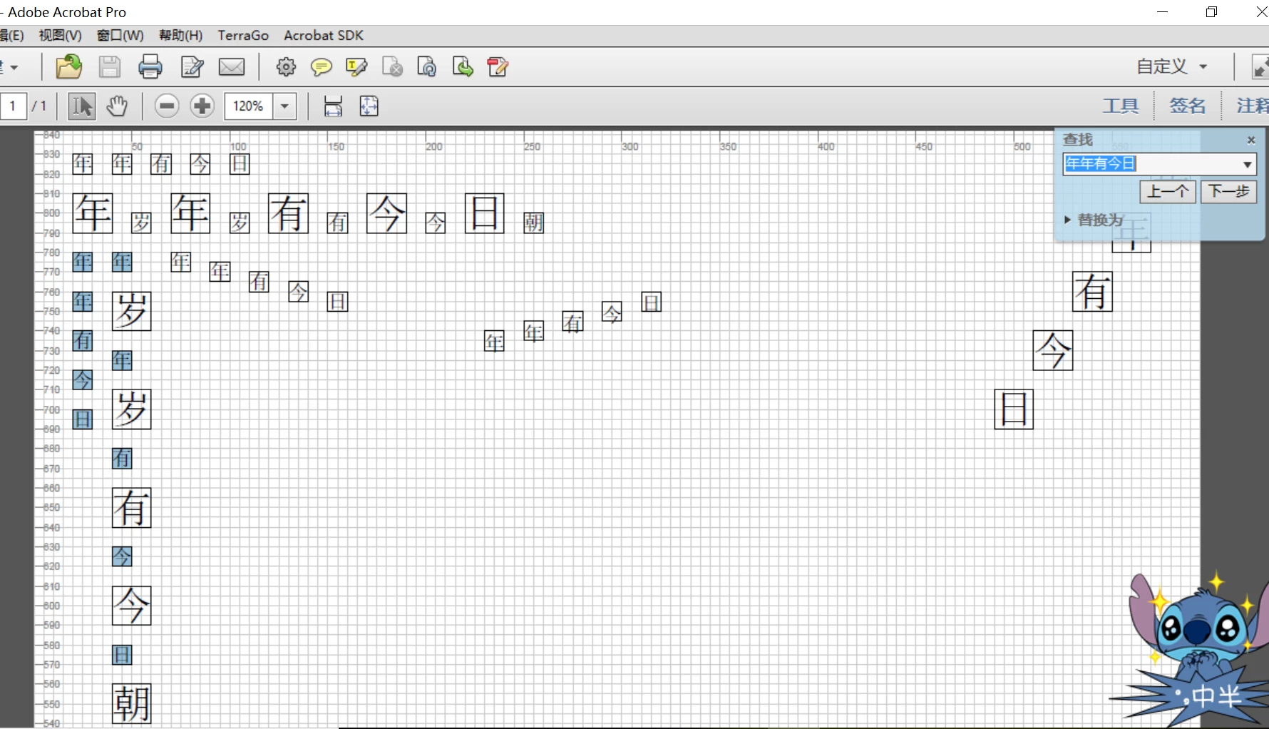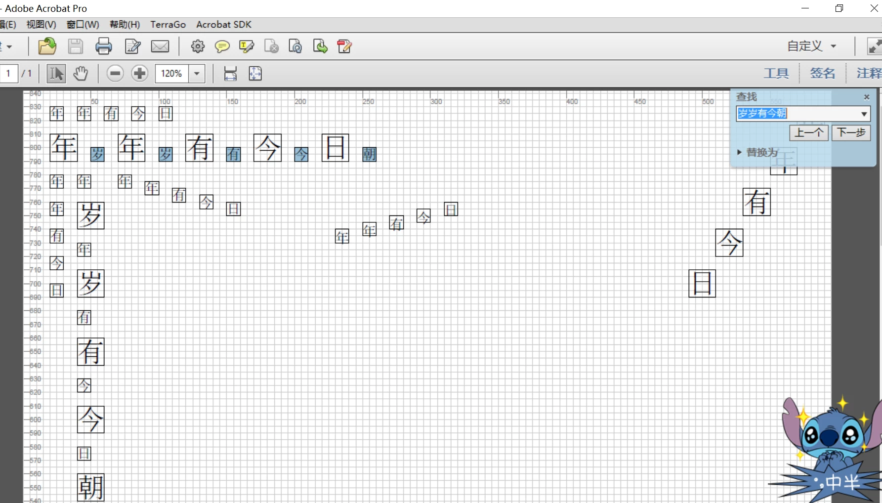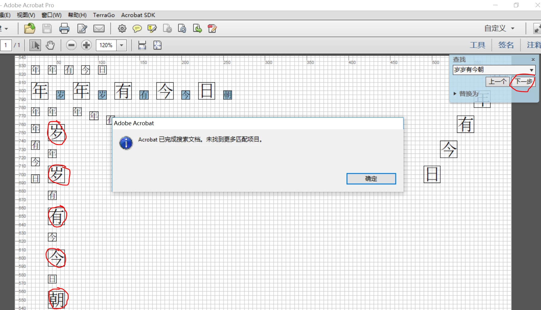In the PDF file, there are two famous Chinese poems, "年年有今日" & “岁岁有今朝”. The former three pictures showed that by using "Ctrl+F", each Chinese character in "年年有今日" could be found. Theoretically speaking, all the characters in "岁岁有今朝" should be found in the same. Unfortunately, as the latter two pictures show, the Chinese characters in a horizontal arrangement coud be found, while none could be found in a verticle lines arrangement. In other words, when I press the "next" button, Acrobat popuped a dialog box saying that "No more matching items found". Obviously, the red circled Chinese characters were missing. Why does this happen?