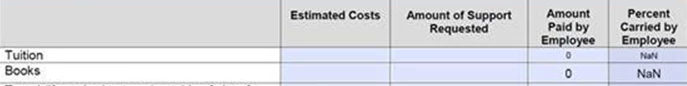 Additionally, I would prefer for all cells to remain blank until filled in and they start to populate. I would also like to format the first three columns in the table as number (currency) and the last one as percentage but am running into additional error codes when doing so.