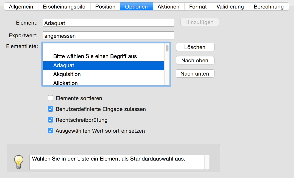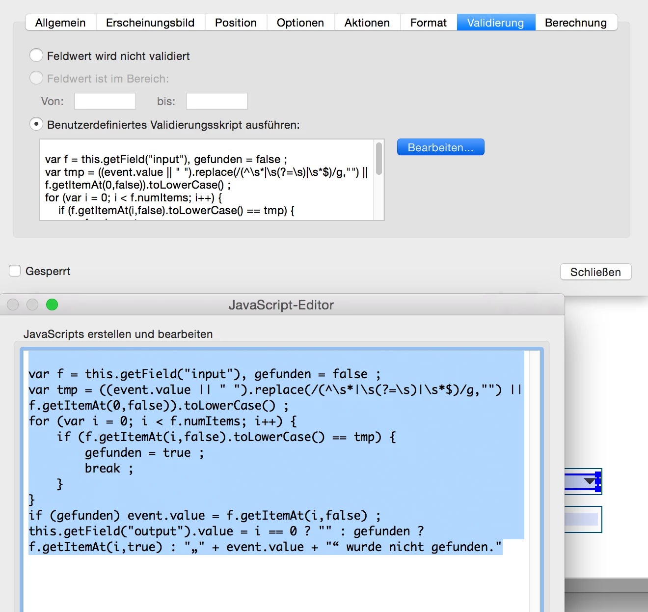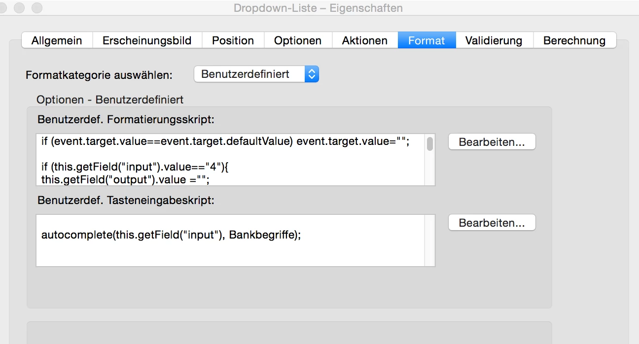 Hello, I've created a dropdown box and clicked "custom input allowed". Each input value has an export value assigned, which then appears in a separat textfield. That works, if I select the input value via dropdown. If I write in manually nothing happens. Here the same export value should appear in the textfield. And if the customer makes an input which doesn't exist, a window should open "Check your details". Can someone help me, how and especially where I can enter this script? In the attachment my example (unfortunately you can not upload it as a pdf). Thank you in advance!