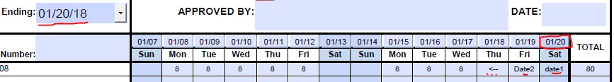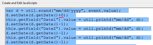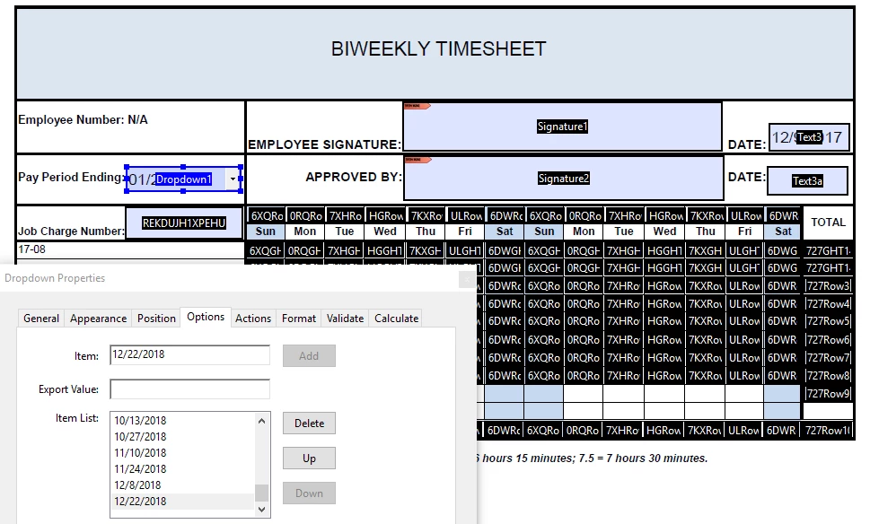 Hi, I am trying to tweak a timesheet that I have added a dropdown box that has dates entered into the <Options>, <Item List> as "1/6/2018" and every 14 days til the end of the year. Where I am stuck is trying to get the javascript that will take the chosen 'Pay Period Ending' date and add to the 14th date field. Then I am trying to get all the other fields to start from this date -1 so that each date of the two-week period is shown. This way, the dropdown date will automatically update the pay period dates. I made some progress following these instructions https://answers.acrobatusers.com/How-autofill-date-field-based-field-selection-q286091.aspx and got the end date to reflect my date but could not get subsequent fields to -1 from the other for the staggered dates I need. The only other issue was date format in that drop downs are MM/DD/YYYY but the 14 date fields for column hours tally are too small and need to be MM/DD. Thank you.