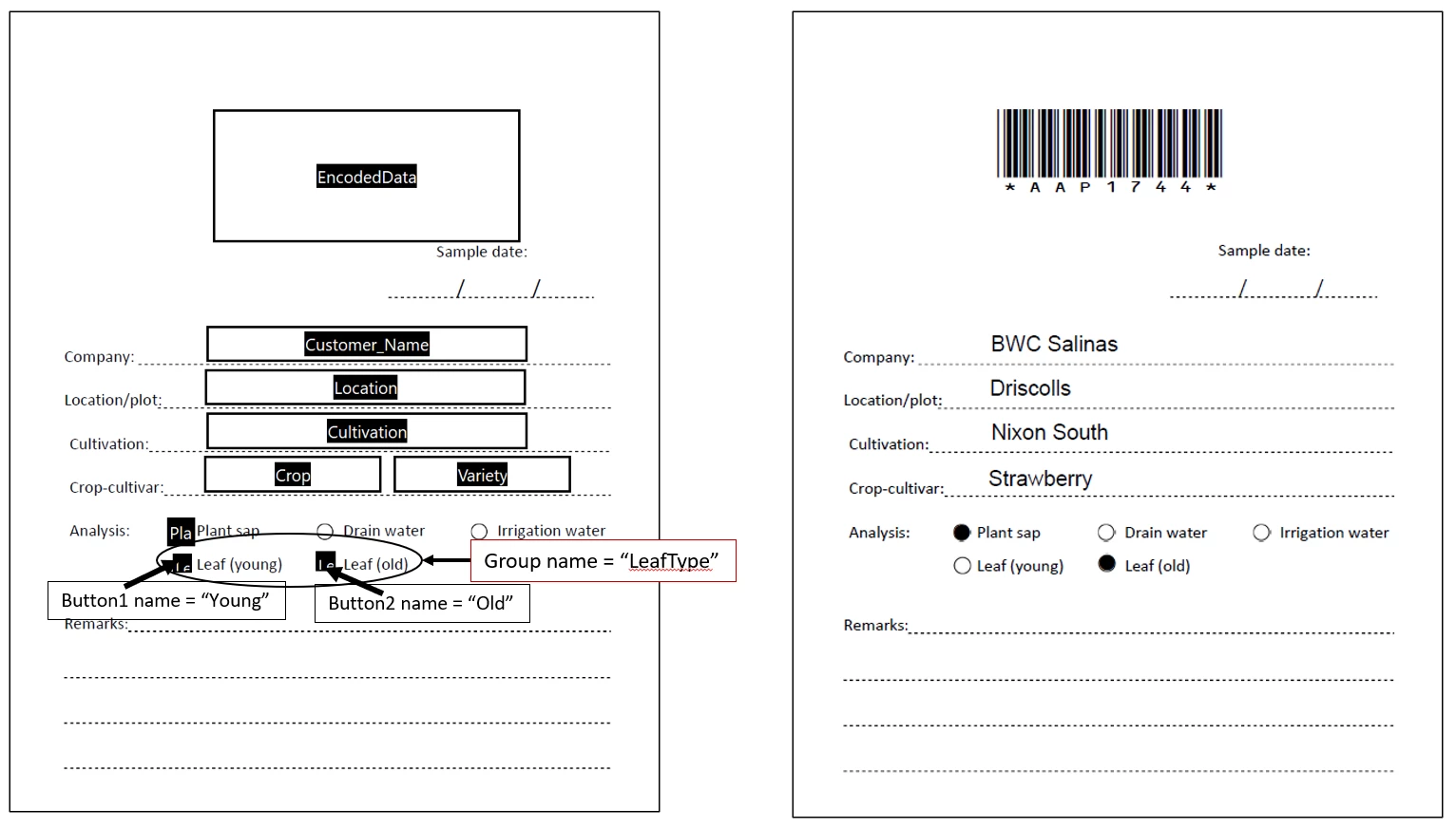 I have an Acrobat Form with a 2 button radiobutton Group named "LeafType". One button is named "Young", and the other button is named "Old".