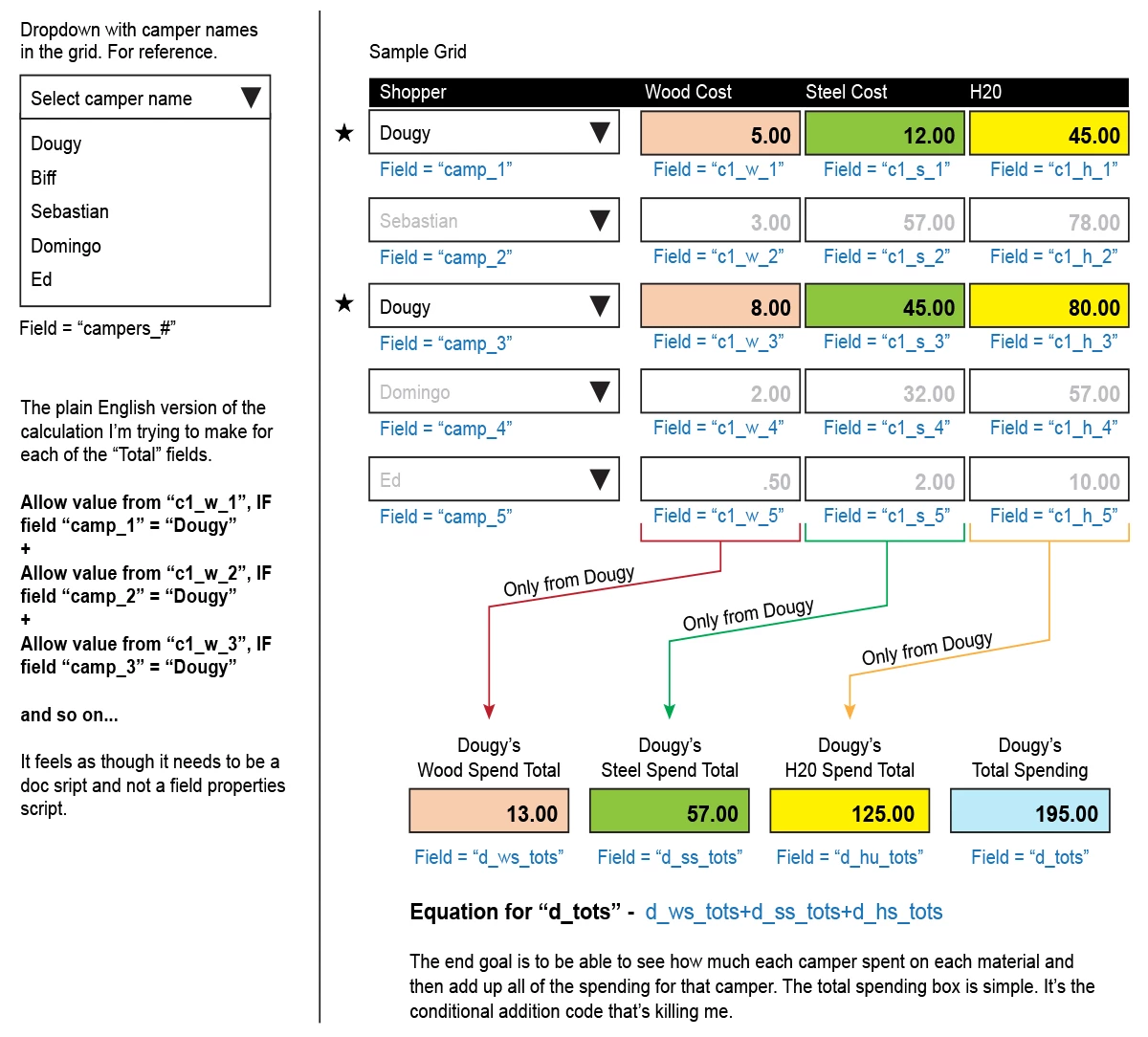 if (this.getField("camp_3").valueAsString=="Dougy") total+=Number(this.getField("c1_w_3").valueAsString); // etc.
