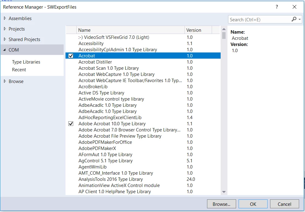 I have Adobe Acrobat Standard DC installed core version 18.2304. I'm using Visual Studio 2017 and using Visual Basic. I'm trying to create a code to mark a pdf drawing as a draft. I'm starting from the example on one of Adobe's iac developers's guide example thinking that would be a good place to start. I tried out the code that starts on page 23. It didn't work, and I've narrowed the problem to the JSObject. I can use methods from pdDoc to get the correct filename for the PDF, so I think all is working up to that point. The jso object also isn't nothing, so it enders the if statement, but the jso object doesn't have any of the methods used by the pdf example available, so it throws me an error when I try annot = jso.AddAnnot. I have the below references added to the project. Anyone have any idea what the issue might be? Thanks in advance for any help!