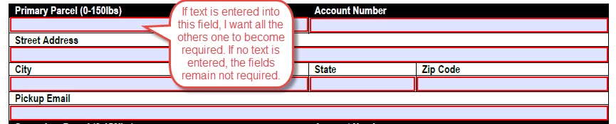 I want to make it where if some enters text into one field, it makes a handful of fields following it required. If no text is entered, the fields remain not required.