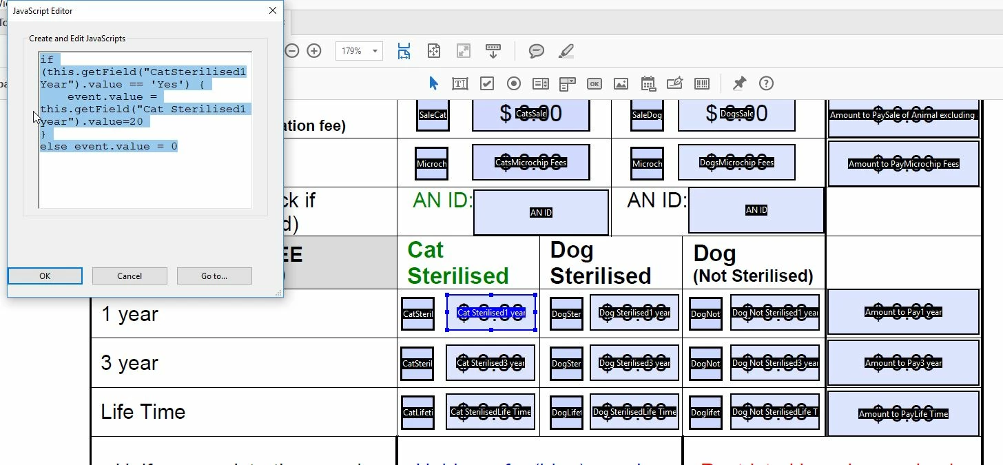 I have a document (attached link - screendump below) which I have added fields which if ticked, automatically puts the amount owed but if say if the rangers pick up say 2 or more animals, how can I then get the figure to multiply by the number of animals - I guess I would need to add another box to select the number of animals etc but what would the formula be please? I have added the file via Dropbox (I hope it works)...