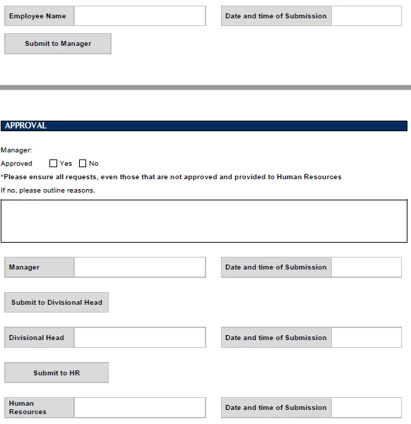I have an adobe form that needs to be signed off by the employee, manager, divisional head and HR and should all be mandatory fields. My problem is that I am unable to make these mandatory for each separate person as they use the form and then submit it to the next person. i.e. employee fills out the forms and is required to sign their name and date (mandatory) before submitting this to their manager, when the manager received the form they are required to sign their name and date (mandatory) before submitting this to the divisional head?
