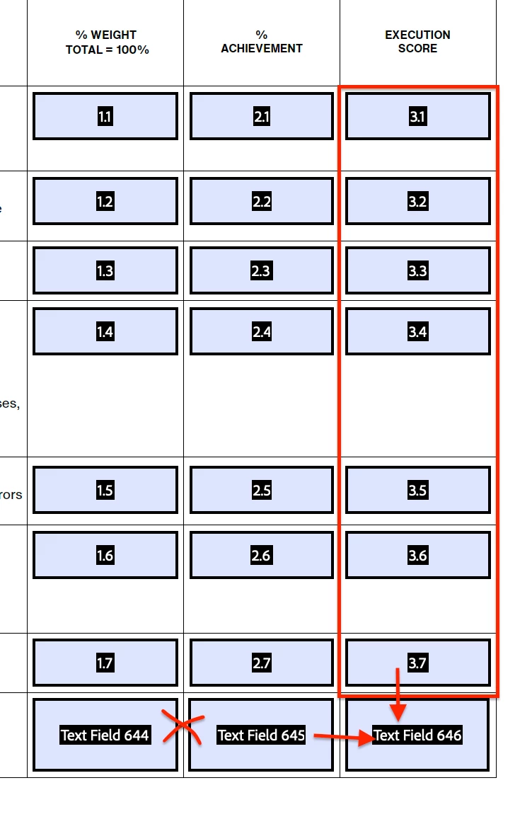 Hello, Everyone! I'm still learning on how to prepare a form in Acrobat. I would like to ask your help on how to get the total multiplication of the Text Field 644 and Text Field 645 and adding the total sum of the execution score in one Text Field.