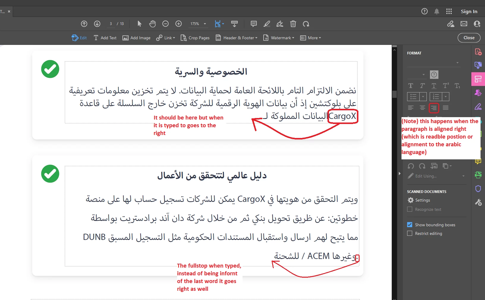 So i have a PDF document which was made in English and i was translating it to arabic. The customer wants to keep the design of the PDF so i accepted then copied my translated work to the pdf document which i started editing in adobe acrobat pro 2022 my problem is that the english source document is left to right and i tried making the paragraphs right to left but when i do this the full stops go to the right as well even though it should be infront of the last word written and when ever there is an english word in the end of the paragraph it goes to the right too so i don't know what should i do, i am not an expert in acrobat and i need quick help
