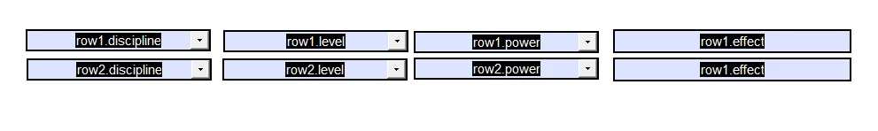 I have 7 options in the first column (discipline), and 5 levels in the second column (level). Depending on what is selected in those two, I need to auto populate different options in the third row (power).