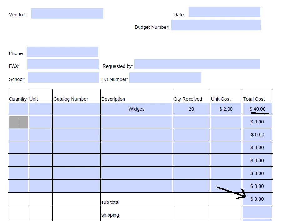 I have a line item order form I'm working on. There are seven lines in which the user can entered their quantity/unit cost/etc. I've set everything up to calculate the total cost for each line (last column on the form), and then these total costs are summed as the sub total at the bottom of the form. This works beautifully. The problem is I think I need a custom code to sum the sub total at the bottom of the form EXCEPT when there is only one total cost value on the form in which case the sub total field should just grab that with no calculation. I hope this makes sense? Thanks for any help you have!