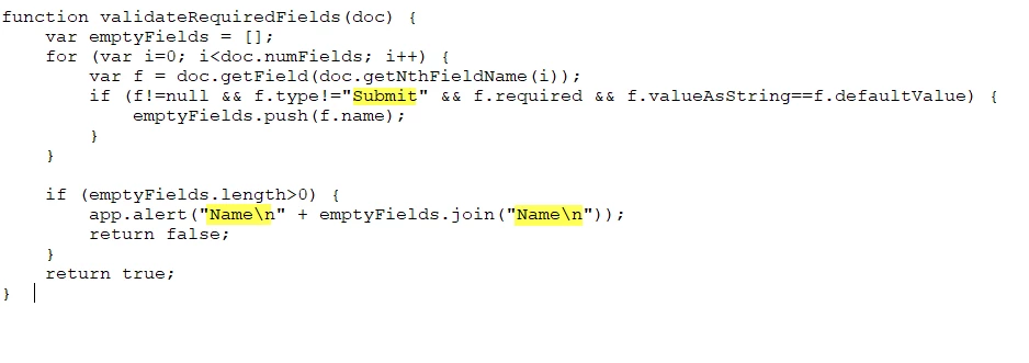 I've created a form in which certain check boxes and fields are required. When clicking on the submit button, I would like it to verify if those check boxes and fields have been filled in. If they have, then send a mail with the PDF. However, if they haven't, then highlight the empty fields.