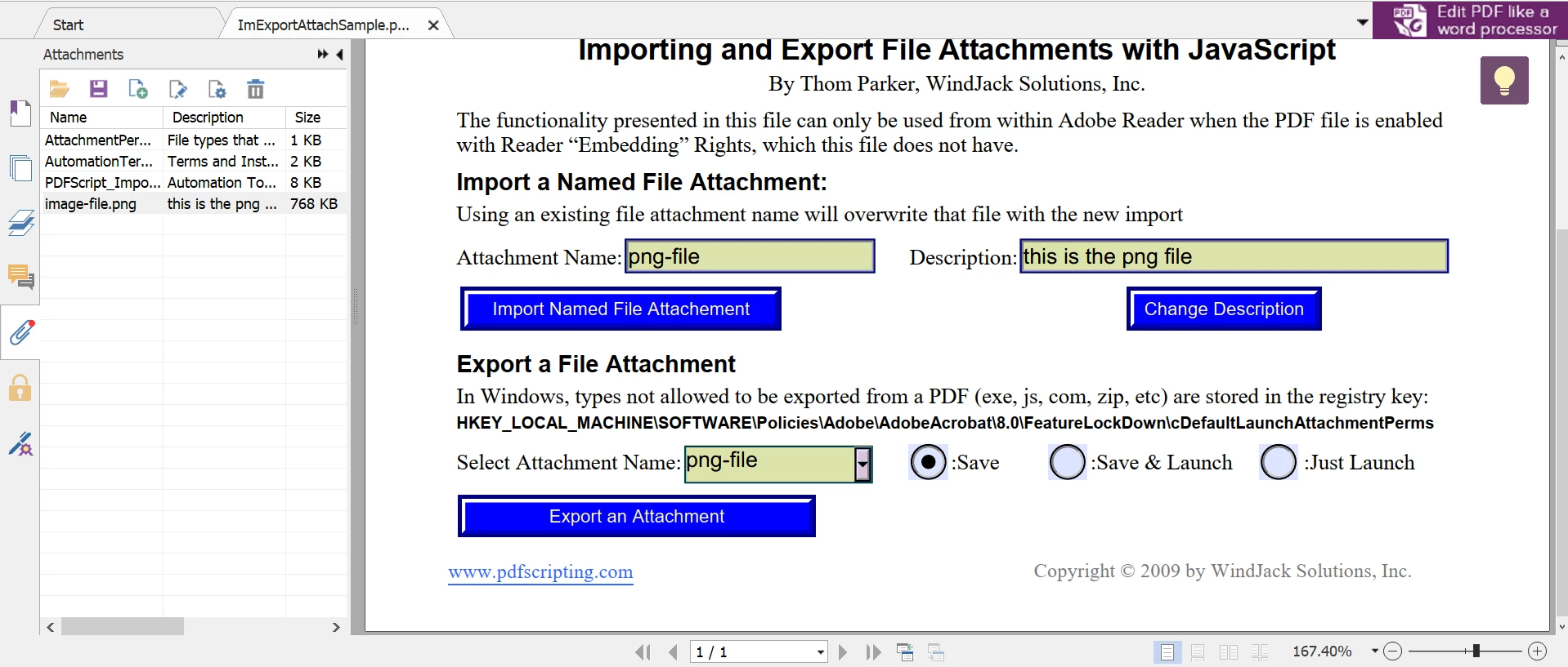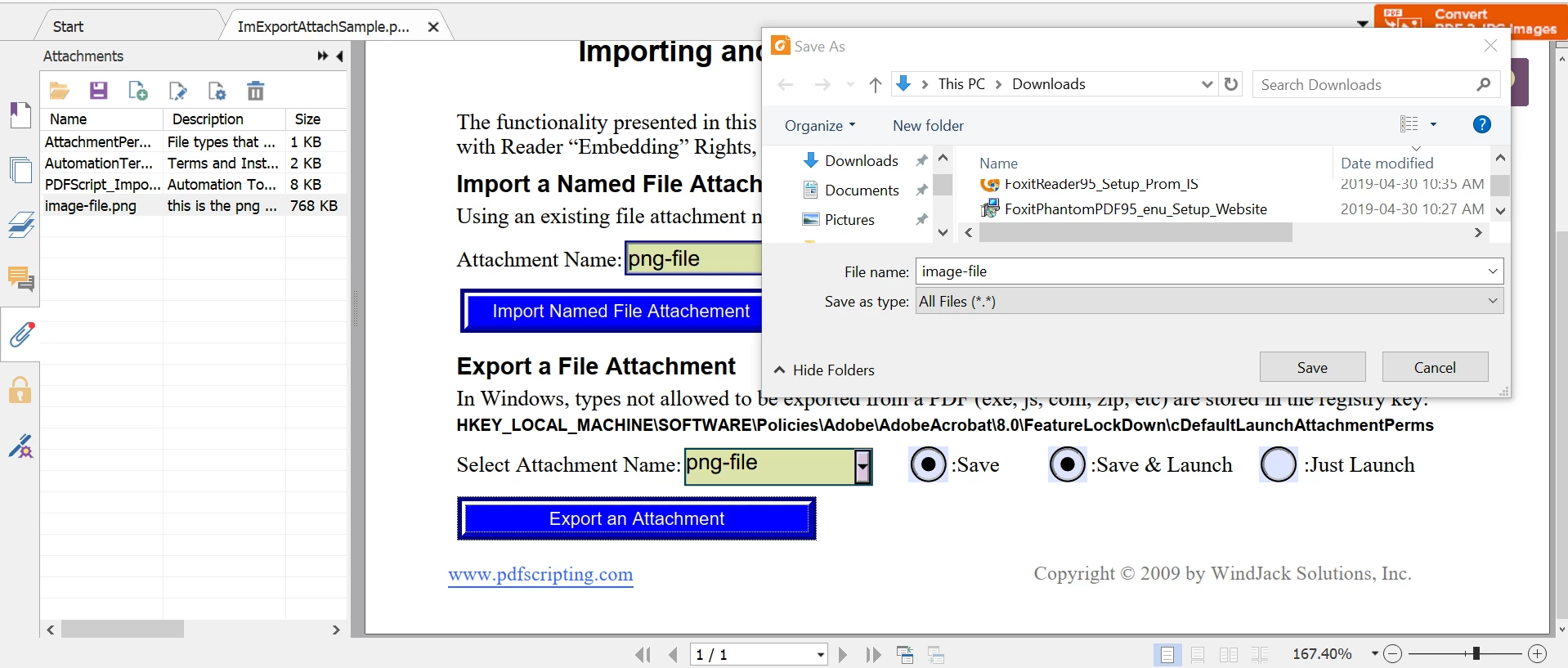 I am using the file at https://www.pdfscripting.com/public/FreeStuff/PDFSamples/ImExportAttachSample.pdf for uploading and downloading attachments. But when downloading the attachments the extension is getting lost. So, how to retain the extension? I am uploading files with extensions like docx, png, jpeg, xls, etc
