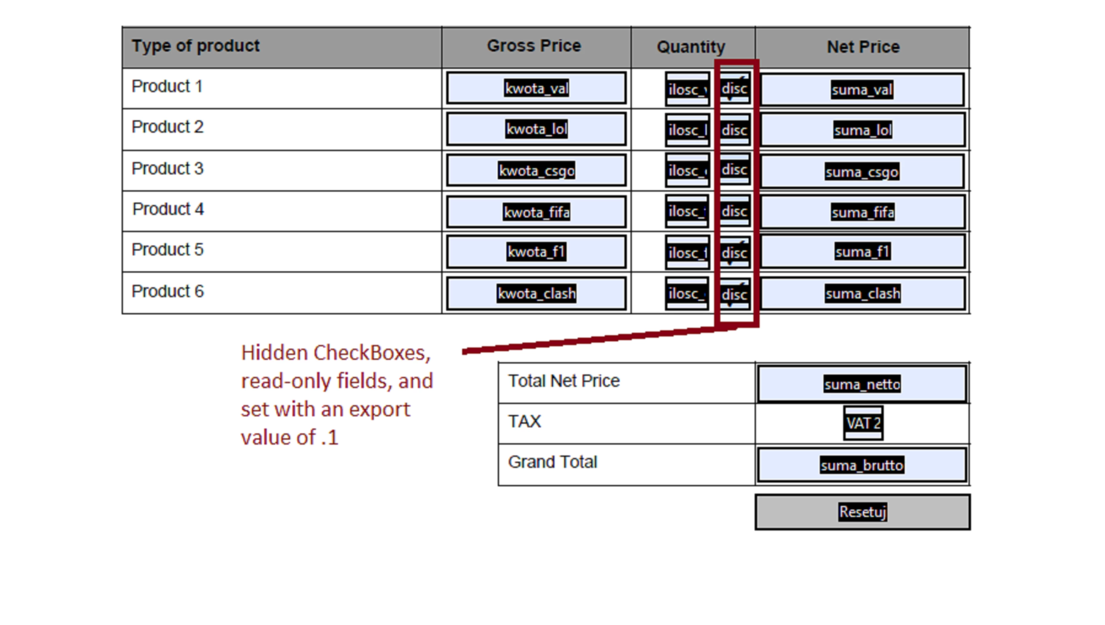 I made a pdf form with calculating net and gross price where customer can type how many of products wants to buy and it works all fine (attachment).