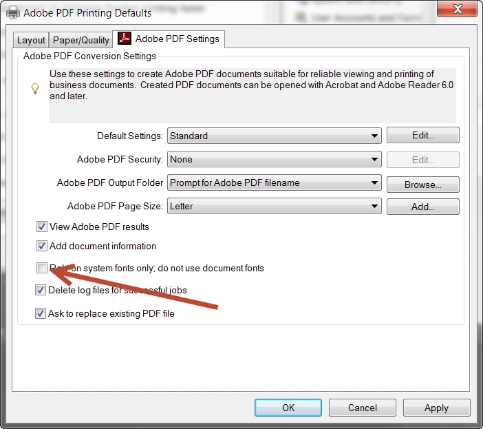 In that dialog, make sure to deselect the Rely on system fonts only. Do not use document fonts option. (See below, pointed to by arrow!) Press OK all the way back to the Printer Control Panel. Restart the application from which you were trying to create PDF via Adobe PDF and see if that resolves the problem.
