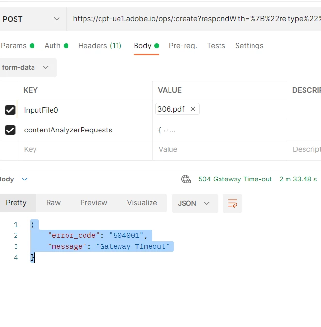 I am converting the pdf file into docx using adobe api with postman. It is working with small files but when i am trying to upload larges approx 50 MB file then i have got an error .