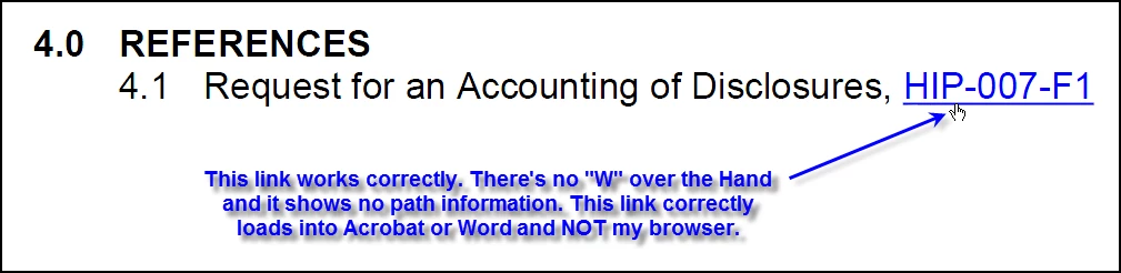 Links in newly created PDFs from Word now try to open in my browser instead of their native program. That is, if I have a link to a PDF or Word document in a Word document and PDF it using the Acrobat tab and selecting "Create PDF", when I click on a link in the newly created PDF, it tries to open it in my browser and not Acrobat or Word and when I hover the Hand cursor over the link (see Screenshot #1 below), it now shows a "W" in the hand, which means "Open a web link", whereas links in documents that I created previously the same way have no "W" over the hand (see Screenshot #2 below) when I hold my cursor over a link in a PDF and they open into the correct program (Acrobat or Word) when I click on them.