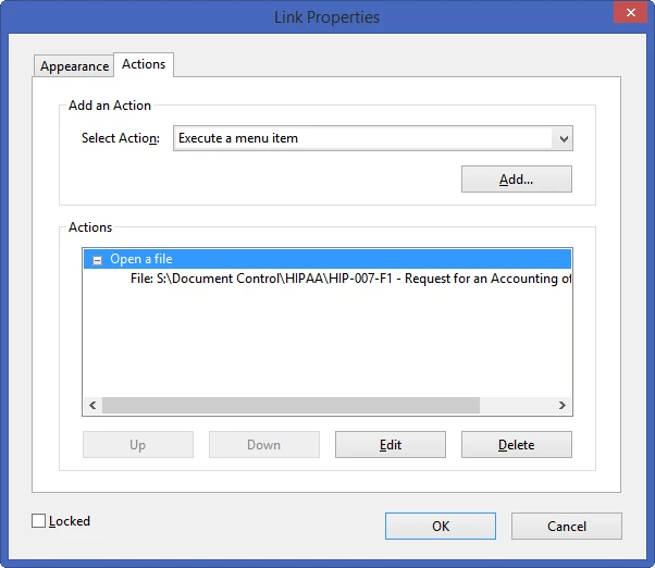 The files that used to be created (prior to 06/29/2016) have the Link Properties as "Open a file" (see Screenshot #4 below):