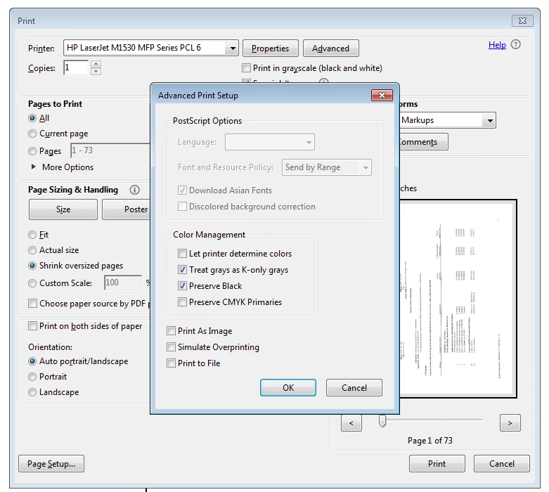 Pretty much all of the PDFs I print are coming out as negative. Some come out normally but I can't predict which ones. I enabled print in grayscale, which is now disabled, but this isn't working. Also uninstalled Reader and installed Reader DC, which hasn't fixed the problem. There should be an option to select/deselect Negative per here: Advanced PDF print settings, Adobe Acrobat but I can't find it in the Advanced Print Setup dialog box. Do I need to look elsewhere?