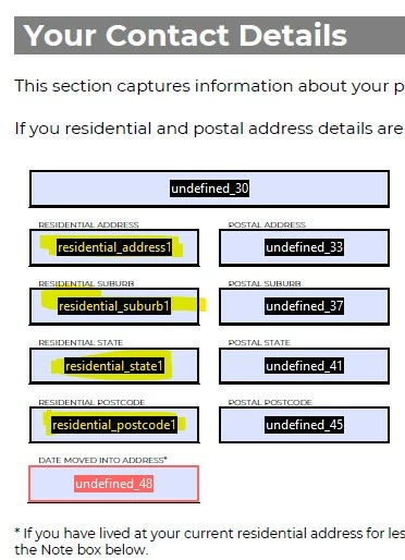 When the dropdown list is set to "Sole-Trader", the data for fields "undefined_68, 70, 72 & 74" is to come from the following fields, which have been completed earlier in the document.